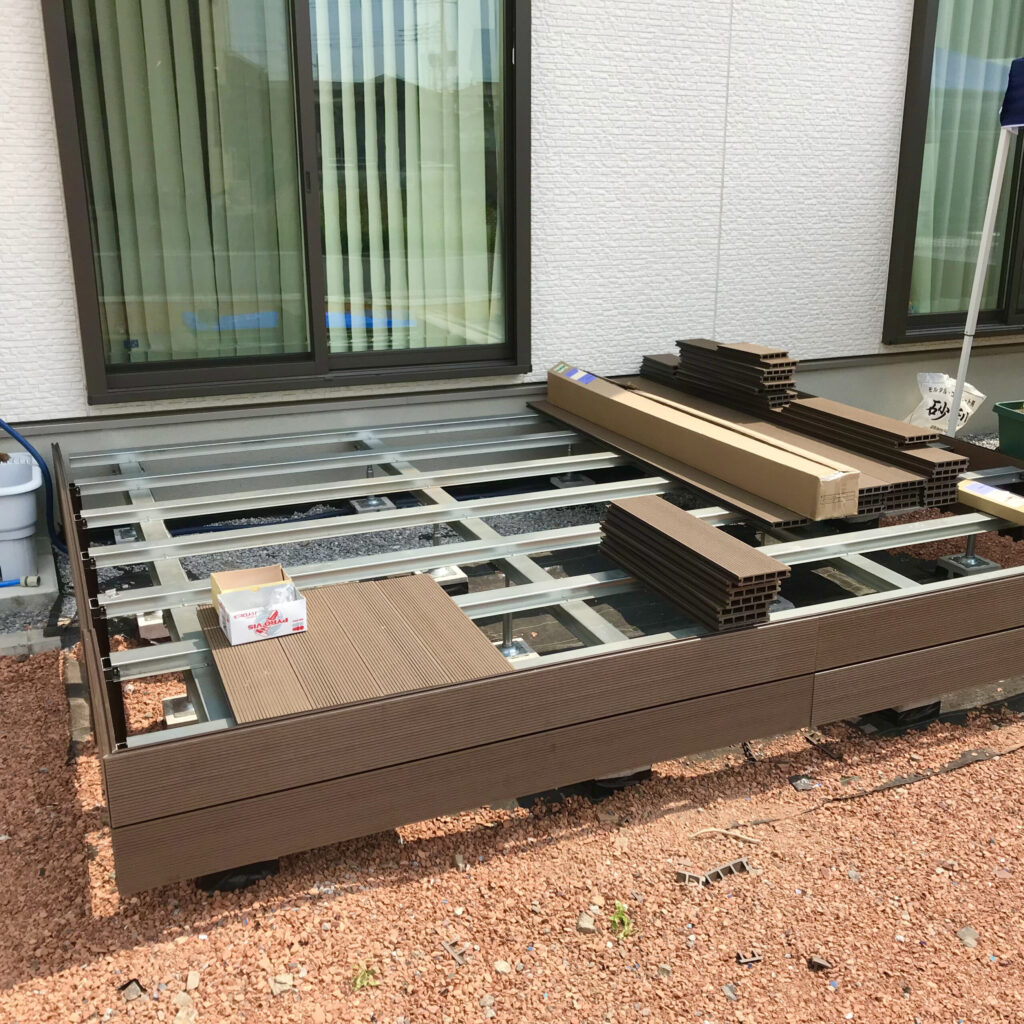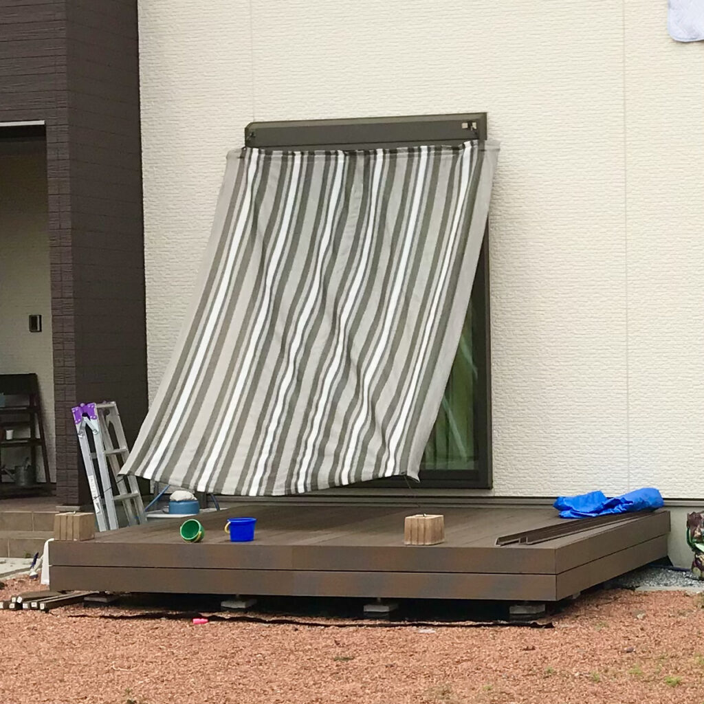 - 人工木と鉄骨で作ったため5年以上経っても劣化なし。BBQや子どものプール遊びの「基地」に