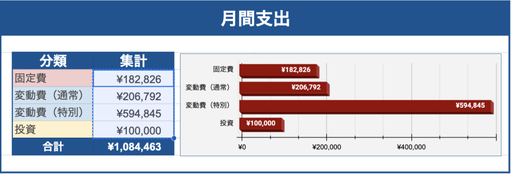 | 変動費 | 206,792 | 食費、外食、娯楽、医療費など |