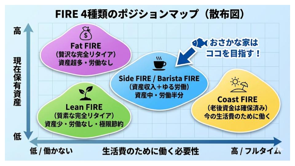| 項目 | 完全FIRE | サイドFIRE (おさかな家の目標) |