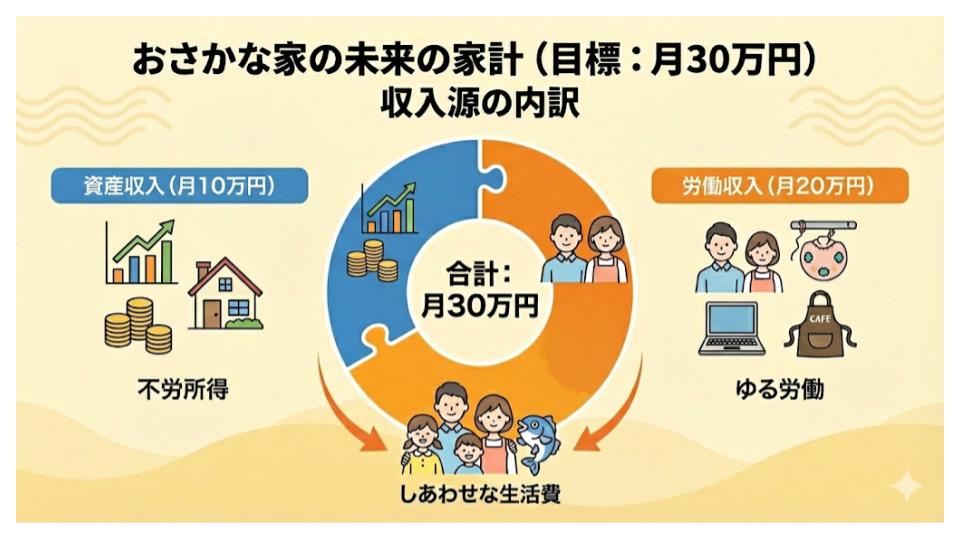 - 労働収入:残りの半分を「好きな仕事」や「ゆるい労働」で賄う